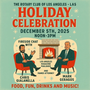In lieu of our traditional Friday luncheon, join LA5 for its annual Holiday Party celebration at Engine Co. No. 28, as Los Angeles Magazine President and Publisher, and LA5 Member Chris Gialanella, hosts a fireside chat with honored guest speaker, noted trial attorney Mark Geragos.